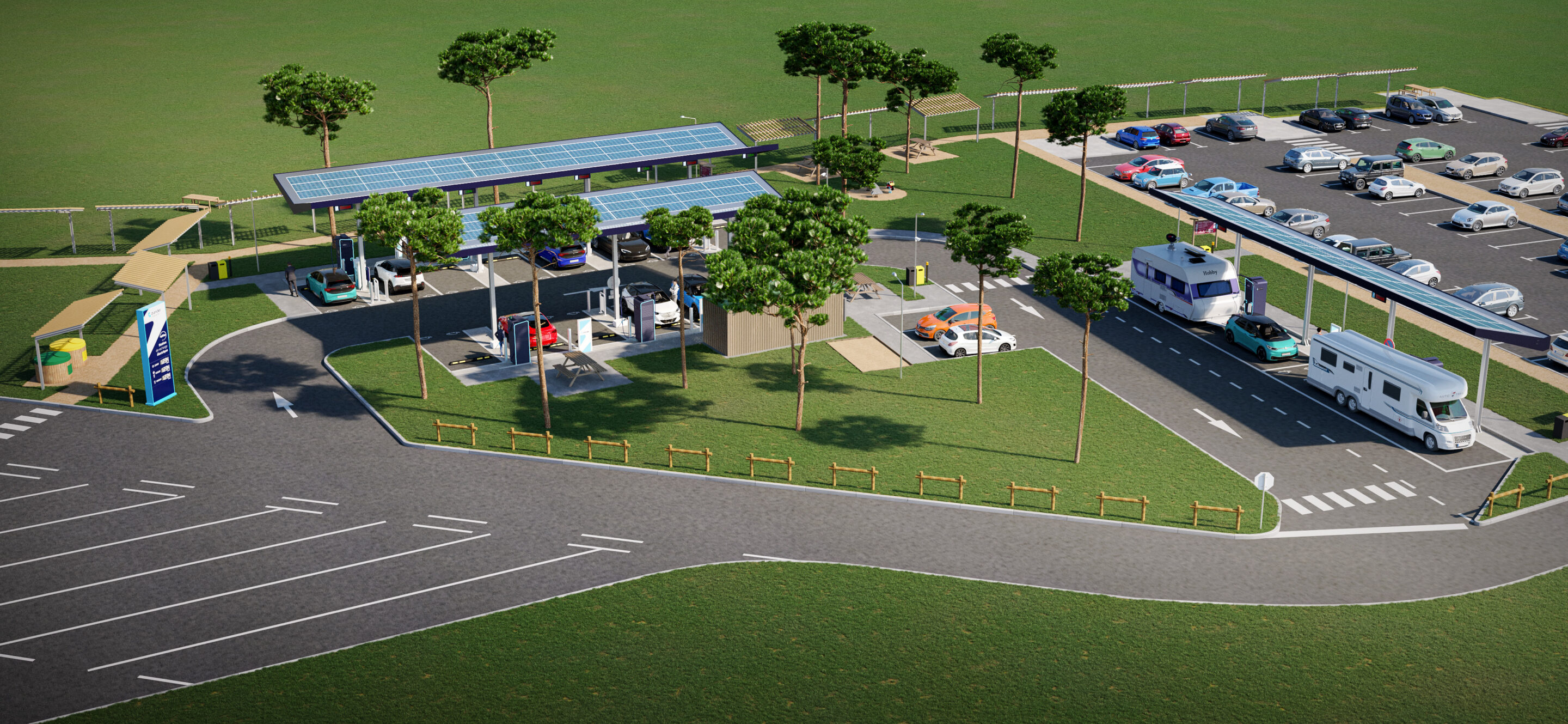 14 points de recharge pour véhicules légers (VL) et 2 points de recharge pour véhicules légers avec remorque (VLR) d’une puissance maximale de 400 kW, seront disponibles sur chacune des quatre stations et seront abrités par un auvent photovoltaïque. Ces ombrières photovoltaïques construites dans un second temps, à l’issue de la période estivale, permettront de produire de l’électricité et protègeront les utilisateurs des intempéries.